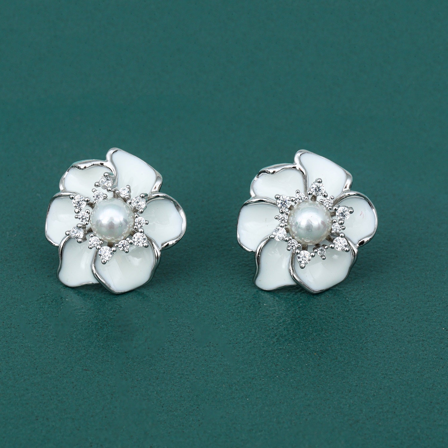 MAIRA Graceful Floral 925 Sterling Silver Earrings Pearl Enamel & Cubic Zirconia Studs for Girls / Women